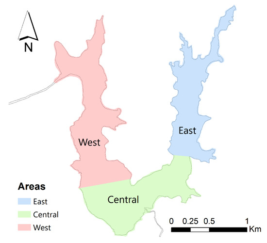 To organize the presentation and discussion of the simulation results, the domain was divided into three areas, according to the particularities of each zone, namely, west, the portion influenced by inflow and outflow; central, the location that directly receives the inflow, with the most intense water flow in the system and the deepest regions of the lake; and east, the most controlled portion of the lake, without a water inflow or outflow system (Figure 6).