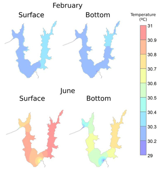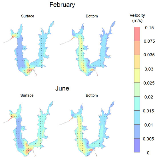 Figure 7 shows the surface- and bottom-circulation pattern of Água Preta Lake in February (rainy) and June (dry) 2024. These months were chosen because they represent seasonality, and, according to [36], they show that February and June are the months with the lowest and highest wind speeds, respectively.