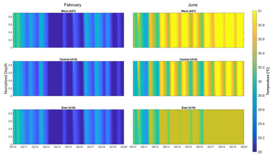 Observation points A07, A10, and A16 were selected to represent the western, central, and eastern portions, respectively. This enables an understanding of the stratification patterns over time in the system.