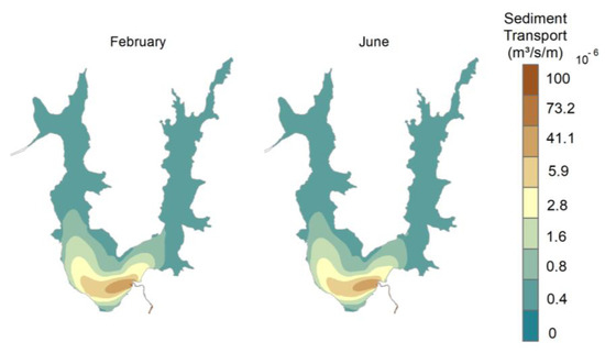 This sediment load from the system’s inflow tends to flow from the central sector to the western sector, due to the current formed between the inflow and outflow points, resulting in the western side of the lake having more turbid waters than the eastern side. Between seasonal periods, there is no significant difference in transport. However, there is a slight contrast in the way the sediments dispersed. In June, due to the increased intensity of the lake currents, the sediment load tends to concentrate more in the central region, as the velocity vectors of the lake coming from the north push the sediment load towards the central region. However, in February, this speed decreases, which allows for greater spreading of these suspended sediments. This can be observed at the tip of the transport cloud in the easternmost region, where in February, transport tends to be directed slightly more to the east.