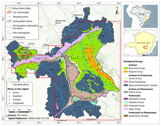 In Brazil, the Iron Quadrangle (IQ), located in the state of Minas Gerais, represents a region of strategic economic importance due to its mineral wealth and long-standing history of mining and steelmaking. Within this context, the Upper das Velhas and Upper Paraopeba river basins are particularly vulnerable, as they encompass densely populated areas, critical water supply sources, and regions heavily impacted by extractive activities. These basins have been extensively studied in the past two decades due to their diverse lithology and long-standing mining legacy [14,15,16,20,21,22,23,24,25,26,27,28,29].