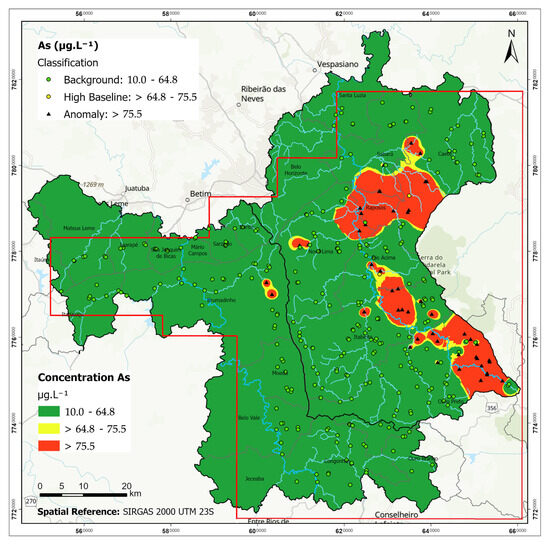 For arsenic, 26.7% of the samples exceeded the limit of quantification (57.7 µg·L−1), with concentrations up to 414 µg·L−1. Most elevated values occurred in the Velhas basin, particularly in Ouro Preto, Rio Acima, Nova Lima, Raposos, and Caeté. The Paraopeba basin had only two quantifiable values above 90 µg·L−1 in a minimally impacted area in the city of Brumadinho (Figure 2).