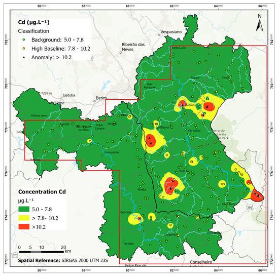 Cadmium levels ranged from <5 to 19.6 µg·L−1, with 73% of values below the detection limit. Among quantifiable samples, 74 points exceeded the drinking water limit (5 µg·L−1). The spatial distribution (Figure 3) shows that most anomalies are observed in the Velhas basin, particularly in the headwaters and areas with mining or domestic effluent discharge.