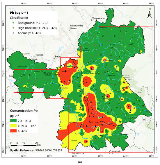 Lead concentrations exhibited the largest anomalous area (13.8%), with values up to 201.4 µg·L−1 (Figure 4a), far exceeding the national limit (10 µg·L−1) in 25.3% of samples (Table 5). Elevated Pb levels were prevalent in both basins, notably in the southwestern Velhas basin and phyllite/itabirite domains of the Paraopeba basin, where mining activities are intensive.