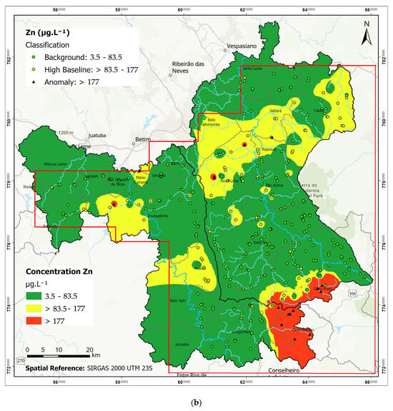 Zinc ranged from <3.5 to 2198 µg·L−1, with a median of 45.3 µg·L−1. Only 2.8% of samples exceeded the Brazilian limit of 250 µg·L−1. Zn anomalies were spatially dispersed, occurring in both rural and urban areas, as well as in some environmentally protected zones. Concentrations above the UIF value (177 μg·L−1) were observed at 18 sites across the two basins (Figure 4b).