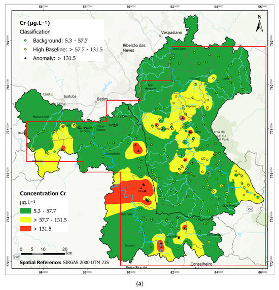 Chromium concentrations (Figure 5a) varied between <5.3 and 326.4 µg·L−1, with 38.3% of samples exceeding the drinking water threshold of 50 µg·L−1. Anomalies above 131.5 µg·L−1 were recorded in 18% of the samples. Nickel levels ranged from <20 to 264.7 µg·L−1 (Figure 5b). Seventy-five percent of samples were below 31.5 µg·L−1. A total of 57 anomalies were identified, with 10.1% of samples exceeding the Brazilian standard (70 µg·L−1).
