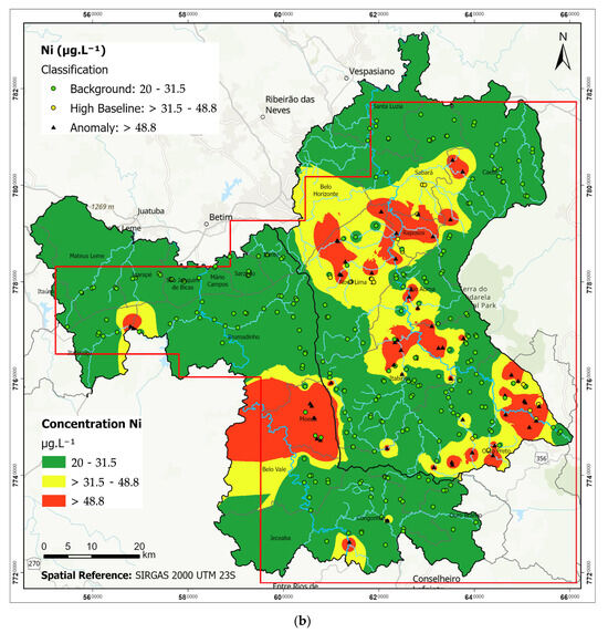 Cr (a) and Ni (b) geochemical map of surface waters in Upper Velhas River and Paraopeba River basin, IQ region, Minas Gerais, Brazil.