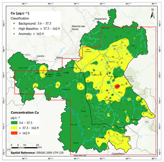Cu geochemical map of surface waters in Upper Velhas River and Paraopeba River basin, IQ region, Minas Gerais, Brazil.