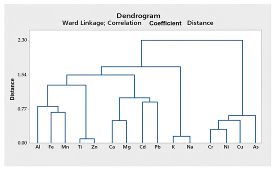 The data were also analyzed using cluster analysis (CA) to explore associations and variations in element concentrations across different locations. CA is a multivariate analytical technique that groups similar observations into classes, employing similarity or distance measures to form a dendrogram [48].
