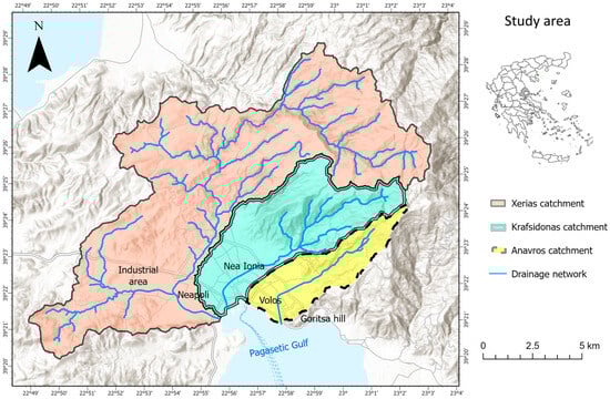 The Xerias, Krafsidonas and Anavros ungauged catchments comprising the study area, are located in southeastern Thessaly, Greece (Figure 1). The city of Volos serves as the administrative center of the Magnesia Regional Unit and is positioned along the Pagasetic Gulf to the south and at the foothills of Mount Pelion to the east. It has an approximate population of 138,865 residents, rendering it as the sixth most populous city of Greece. In addition, it serves as one of the most important ports in the country. The area is characterized by dense urbanization in the central and western regions, transitioning to more sparsely urbanized areas towards the north and east, while the surrounding areas are covered by agricultural landscapes, predominantly orchards and olive groves. Also, an industrial zone with various economic activities is situated to the west of Volos [42,51].