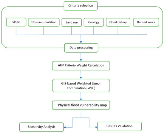 For the evaluation and mapping of flood vulnerability, a GIS-based MCDA approach was employed utilizing the AHP method (Figure 2). Six criteria were selected, based on their influence on flood vulnerability as identified in the literature, and their relevance to the specific characteristics of the study area. The selected criteria include slope, flow accumulation, the hydro-lithological characteristics of the geological formations, land cover, historical flood data and burned areas. These factors significantly influence the occurrence and severity of flood events and have been utilized extensively in flood vulnerability assessment [55,56].