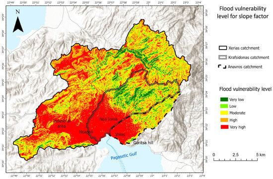 Regarding the slope factor, the analysis based on the thematic map (Figure 3) and the table below (Table 4) indicates a similar pattern for the three catchments as most of the area exhibits high to very high flood vulnerability. The areas within the catchments that exhibit high flood vulnerability correspond to the urban fabric of Volos, its suburbs, and the industrial zone. On the other hand, low and very low vulnerability levels cover less area and are mainly located in the semi-mountainous and mountainous regions of the catchments.