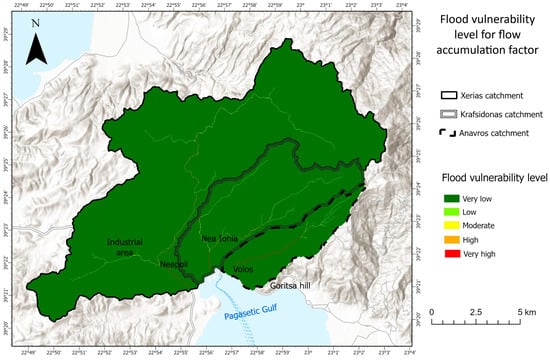 Thematic map showing flood vulnerability levels for the factor of flow accumulation.