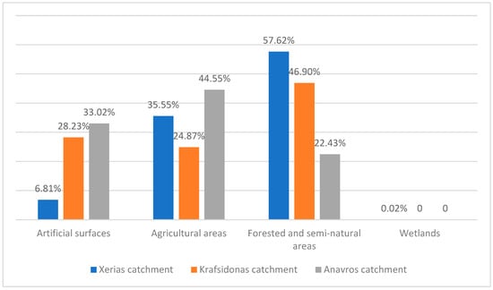 As shown in the graph below (Figure 5) in both the Xerias and Krafsidonas catchments, forest and semi-natural areas cover most of the catchments, while agricultural areas and artificial surfaces cover significantly less area. Especially in Xerias, artificial surfaces cover less than 7% of the total area while wetlands cover an almost insignificant portion (0.02%). On the contrary, artificial surfaces cover most of the Anavros catchment, followed by agricultural areas and forested and semi-natural areas.