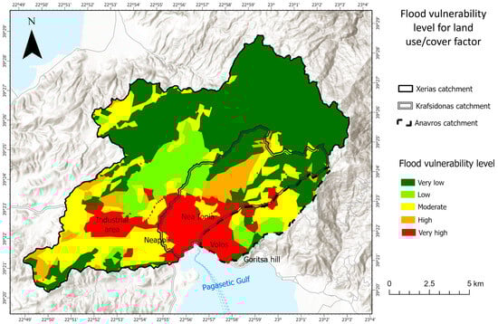 Thematic map showing flood vulnerability levels for the factor of land use/cover.