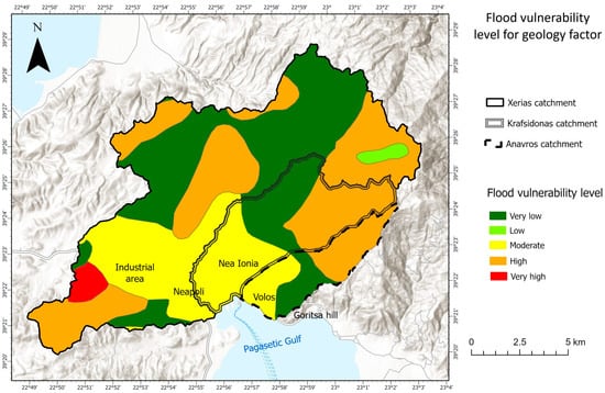 Thematic map showing flood vulnerability levels for the factor of geology.