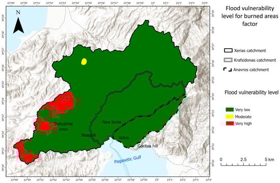 The last factor selected was the presence of burned areas in the study area. Areas with dense vegetation exhibit reduced surface runoff and are thus less prone to flooding. On the contrary, burned areas, as well as urban areas that lack vegetation, face a high risk of flooding [15,55]. To identify burned areas in the study area, data from the European Forest Fire Information System (EFFIS), available at https://forest-fire.emergency.copernicus.eu/ (accessed on 25 March 2025) were utilized. Based on the data, no burned areas were identified in the catchments of Krafsidonas and Anavros. Regarding the Xerias catchment, two burned areas were identified from forest fires that took place in 2018 and 2023 respectively. The first fire incident led to a 0.36 km2 burned area while the one in 2023 to approximately 10.09 km2. The classification of this factor was based on the existence of burned areas in the study area, and on how recent and widespread the forest fires responsible for the burned areas were, while also considering the potential regeneration of vegetation. More recent and extensive burned areas do not exhibit high regeneration of vegetation and therefore face higher flood vulnerability.