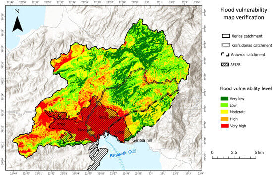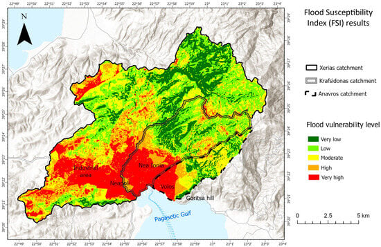 The findings of the analysis showed that the southwestern and central-southern parts of the study area exhibit the highest flood vulnerability, including mainly urbanized and industrial zones. Specifically, 32.76% of the Xerias catchment, 41.16% of the Krafsidonas catchment, and 34.71% of the Anavros catchment exhibit high to very high vulnerability levels. On the other hand, approximately 43% of the total study area, consisting mainly of the mountainous parts of the catchments, showed low to very low levels of flood vulnerability due to steep slopes, permeable geological formations, and dense forest cover.