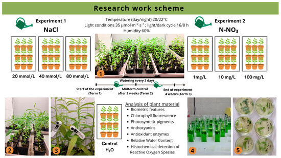 Two independent experiments were conducted to determine the effects of aqueous sodium chloride solution at different concentrations (Experiment 1) and varying doses of nitrate nitrogen (Experiment 2) on selected morpho-physiological parameters of Salix lapponum specimens. The two experiments involved the indirect application of NaCl and N-NO3 solutions at three-day intervals for a period of four weeks. The solutions were prepared in advance and replenished in trays that contained pots with plants (15 plants per treatment in each experiment) (Table 1; Figure 1).