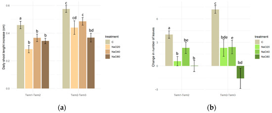 In the first half of the experiment (Term 1–Term 2), the plants of the control sample exhibited a significantly higher average daily growth rate (approximately 0.47 cm) in comparison to the plants treated with NaCl solutions (ranging from 0.30 to 0.37 cm). In the second half of the experiment (Term 2–Term 3), the lowest growth rate was observed in plants exposed to the NaCl80 treatment (approximately 0.37 cm per day). The results of the experiment demonstrated that the growth rate of plants treated with NaCl solutions of 20 mM and 40 mM, as well as those watered with distilled water, was found to be statistically significantly higher during the second stage of the experiment (Term 2–Term 3) in comparison to the first stage (Term 1–Term 2) (Figure 2a).