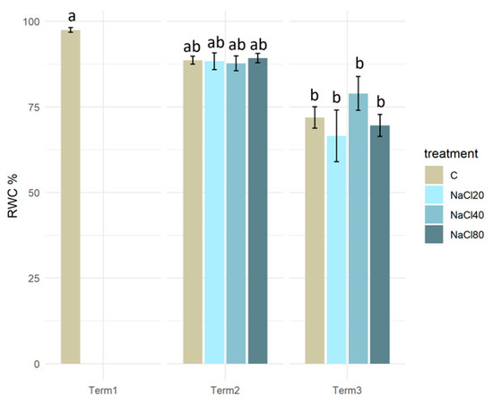 Relative water content (RWC) in the tissues of Salix lapponum exposed to different substrate salinity conditions (n = 5; ±standard deviation). Statistically significant differences (p < 0.05) are indicated by different letters. Comparisons were made (1) between variants at each measurement term; (2) between corresponding variants at different terms. The control group from Term 1 was additionally used as a reference for comparison with each variant in subsequent terms.