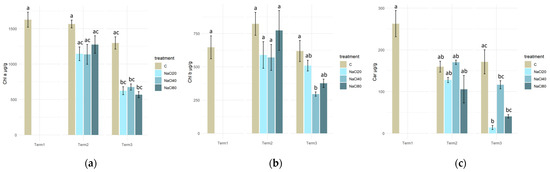Concentrations of photosynthetic pigments. Chlorophyll a (a), chlorophyll b (b), and carotenoids (c) in Salix lapponum leaves exposed to different substrate salinity conditions (n = 5; ±standard deviation). Statistically significant differences (p < 0.05) are indicated by different letters. Comparisons were made (1) between variants at each measurement term; (2) between corresponding variants at different terms. The control group from Term 1 was additionally used as a reference for comparison with each variant in subsequent terms.
