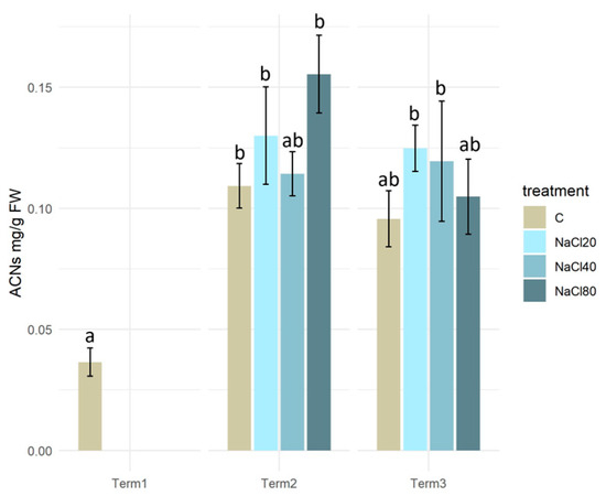 Anthocyanin content in tissues of Salix lapponum exposed to different substrate salinity conditions (n = 5; ±standard deviation). Statistically significant differences (p < 0.05) are indicated by different letters. Comparisons were made (1) between variants at each measurement term; (2) between corresponding variants at different terms. The control group from Term 1 was additionally used as a reference for comparison with each variant in subsequent terms.