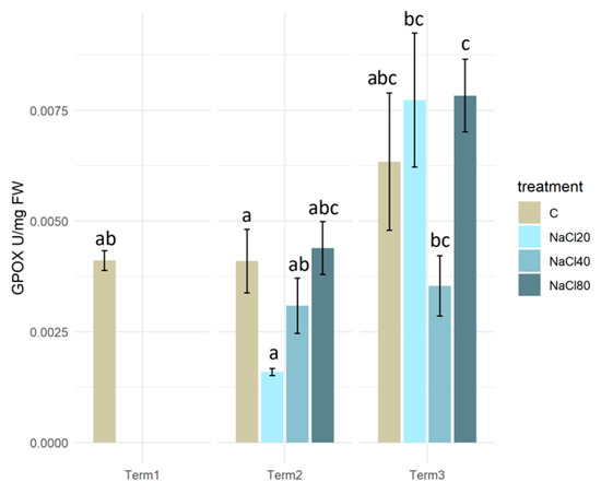 Guaiacol peroxidase activity (GPOX) in the tissues of Salix lapponum exposed to different substrate salinity conditions (n = 5; ±standard deviation). Statistically significant differences (p < 0.05) are indicated by different letters. Comparisons were made (1) between variants at each measurement term; (2) between corresponding variants at different terms. The control group from Term 1 was additionally used as a reference for comparison with each variant in subsequent terms.