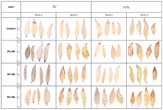 In the case of superoxide anion (O2−), detected with NBT, the intensity of staining exhibited a marked enhancement after a period of two weeks (Term 2), while after four weeks (Term 3), a decline in the intensity of the blue reaction product was discernible, thereby suggesting a reduction in O2− content. At concentrations of 20 and 40 mM NaCl, ROS accumulated was predominantly observed in the petioles and as a spot in the leaf blade. However, at a concentration of 80 mM, there was additionally intense staining within the leaf nerves (Figure 7).