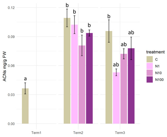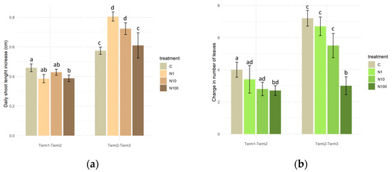 During the initial period of the experiment (Term 1–Term 2), a significant difference in the mean daily rate of shoot growth was observed, exclusively between the control plants (0.47 cm) and those treated with the solution with the highest N-NO3 concentration (0.38 cm). In the second half of the experiment (Term 2–Term 3), plants watered with solutions of 1 mg/L and 10 mg/L N-NO3 concentrations exhibited significantly higher growth (0.72–0.8 cm per day) in comparison to the control plants and those treated with the 100 mg/L N-NO3 solution (approximately 0.6 cm per day on average). A comparison of the mean daily growth rate of the plants across both experimental terms revealed that the plants in all of the experimental variants intensified their growth rate in the second half of the experiment (Figure 8a).