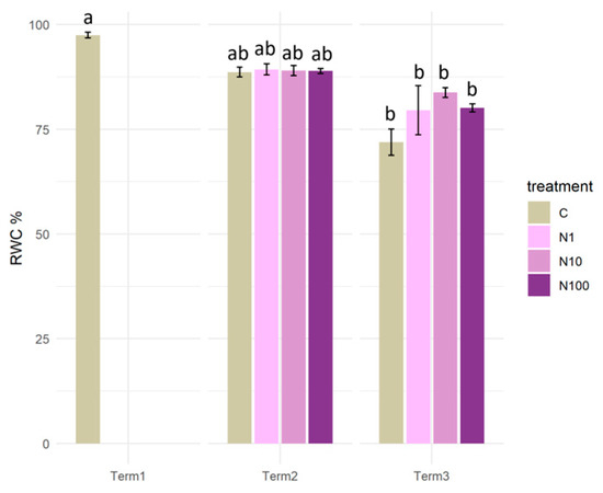 Relative water content (RWC) in the tissues of Salix lapponum under the influence of different concentrations of nitrate nitrogen (n = 5; ±standard deviation). Statistically significant differences (p < 0.05) are indicated by different letters. Comparisons were made (1) between variants at each measurement term; (2) between corresponding variants at different terms. The control group from Term 1 was additionally used as a reference for comparison with each variant in subsequent terms.