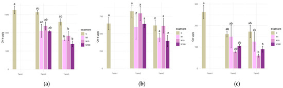 Concentrations of photosynthetic pigments. Chlorophyll a (a), chlorophyll b (b), and carotenoids (c) in Salix lapponum leaves under the influence of different concentrations of nitrate nitrogen (n = 5; ±standard deviation). Statistically significant differences (p < 0.05) are indicated by different letters. Comparisons were made (1) between variants at each measurement term; (2) between corresponding variants at different terms. The control group from Term 1 was additionally used as a reference for comparison with each variant in subsequent terms.