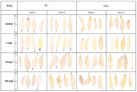 The accumulation of hydrogen peroxide (H2O2) and superoxide anion (O2−) in leaf tissues was assessed using a qualitative method described by Kumar et al. [47] after 2 and 4 weeks of the experiment. Leaves for analysis were collected from the middle part of the shoots.