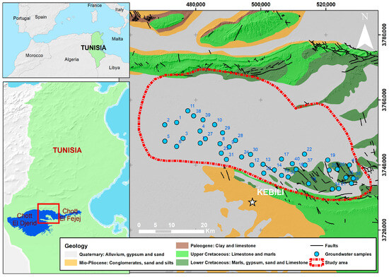 Geologically, the East Kebili region lies on the northern edge of the Saharan Platform and is composed of a thick sedimentary sequence ranging from the Jurassic to the Quaternary. Deep boreholes reveal Jurassic carbonates, mainly limestones and dolomites with marl layers, unconformably overlain by Lower Cretaceous fluvio-deltaic deposits of clays, sandstones, and evaporites. These are succeeded by Upper Cretaceous marine carbonates and shales, marking a major transgressive event, followed by a regional unconformity caused by tectonic uplift during the Paleocene-Eocene. Overlying this are Neogene and Quaternary continental deposits, unconsolidated sands and gravels, forming the Plio-Quaternary aquifer with limited recharge capacity. Structurally, the region is affected by NE–SW and E–W trending fault systems related to Mesozoic and Alpine tectonic activity [45,46]. These faults, along with horst–graben structures, influence aquifer geometry and facilitate upward migration of saline water, particularly near the Chott El Djerid and Chott El Fejaj depressions. The interplay between lithological variation and structural complexity governs groundwater flow, salinization risk, and the connectivity of deep desert aquifer systems in the region [6,45,46].