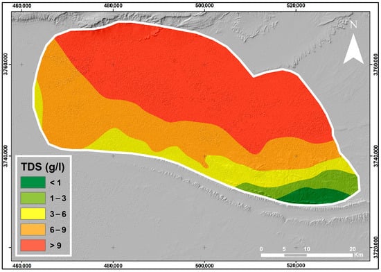 Spatial distribution of TDS (g/L) in the study area.
