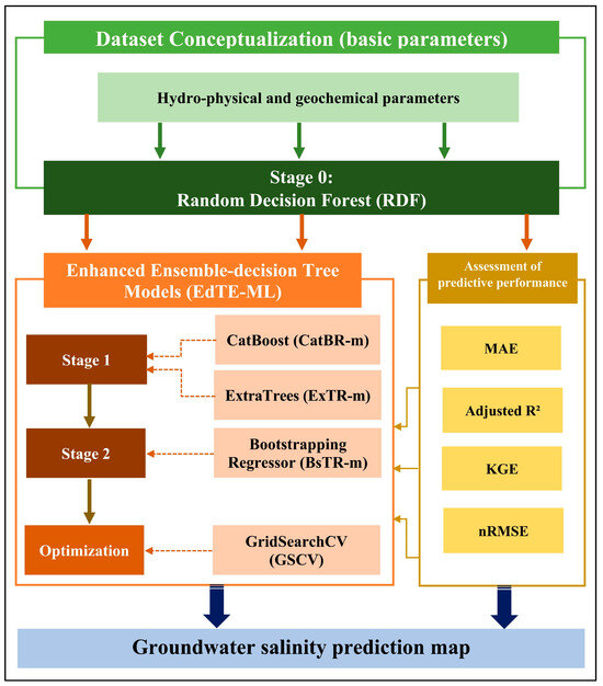 The primary objectives of this research are fivefold: (i) using the random decision forest (RDF) algorithm for feature selection to identify the most relevant groundwater quality parameters for salinity prediction; (ii) conducting a thorough sensitivity analysis with GridSearchCV (GSCV) to find optimal hyperparameters for EdTE-ML models; (iii) applying a two-tier modeling strategy with optimized EdTE-ML algorithms to improve predictive accuracy; (iv) assessing and comparing the performance of individual EdTE-ML models against their combined forms within the dual-stage framework; and (v) generating a detailed spatial distribution map to visualize and predict groundwater salinity across the study area, addressing challenges posed by scarce and limited-quality data.