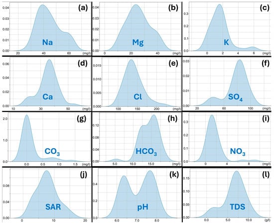 Kernel density (KDE) plots illustrating the variability of predictor and target variables: (a) Na; (b) Mg; (c) K; (d) Ca; (e) Cl; (f) SO4; (g) CO3; (h) HCO3; (i) NO3; (j) SAR; (k) pH; and (l) TDS.