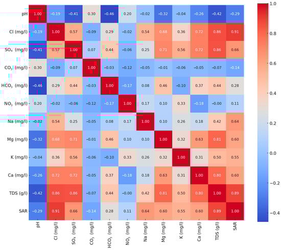 The strong association between Na and Cl, and the positive link between Cl and SO4, suggest a common origin from evaporitic strata or possible mixing with saline groundwater of marine influence. The sodium adsorption ratio (SAR) is also strongly correlated with Na and, to a slightly lesser degree, with TDS and Cl, confirming that sodium enrichment in these waters is a dominant driver of SAR values and that high-sodium waters tend to be more mineralized.