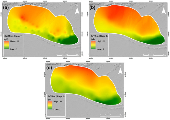 Groundwater salinity distribution maps through EdTE-ML modeling approaches: (a) CatBR-m (Stage 1); (b) ExTR-m (Stage 2); and (c) BsTR-m (Stage 2).