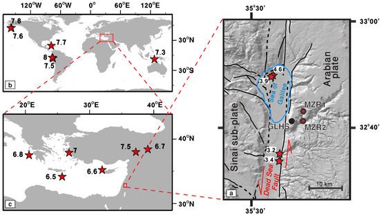 Research area and earthquake locations and magnitudes. (a) The wells (MZR1 and MZR2), seismic station (GLHS), and faults (continuous and dashed lines represent known and estimated fault locations, respectively). Red arrows indicate lateral motion along the Dead Sea Transform. The red stars mark the epicenter of the teleseismic (b), regional (c), and local (a) earthquakes analyzed. The numbers next to each red star indicate the moment magnitude, Mw, of each earthquake.