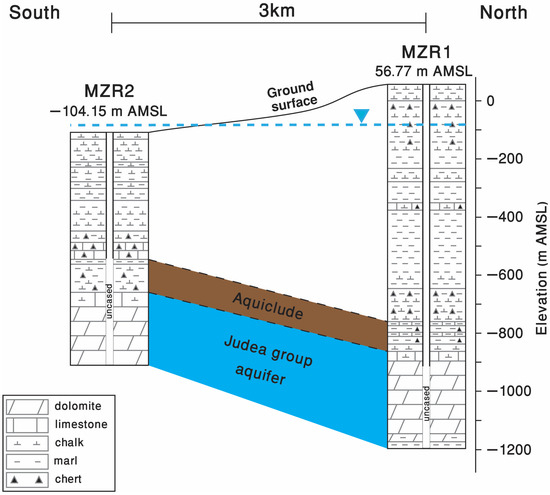 Lithological cross-section between the MZR1 (open) and MZR2 (closed) wells. The wellhead elevation (above mean sea level—ASML) is indicated above each well’s lithological section. The aquifer of the Judea group is confined. The dashed blue line marks the estimated potentiometric surface of the Judea group aquifer between the wells, according to average water level measurements of the wells during 2023.