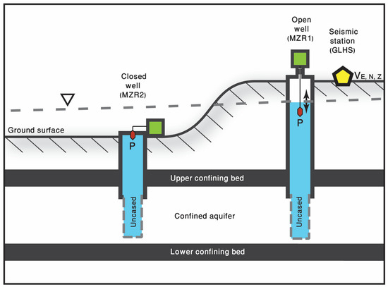Pore pressure oscillations have been vastly reported to correlate with seismic waves [1,2,3,4,5,6,7]. These pore pressure oscillations are induced by stress variations due to cyclic loading associated with passing seismic waves [8]. The stress variations lead to strain changes in porous media, which affect the pore pressure. Water level oscillations as a response to seismic waves depend on the earthquake magnitude and the distance between the epicenter and the well. Earthquakes with high magnitudes (Mw > 7) could cause water level oscillations at wells located thousands of kilometers away from the earthquake’s epicenter. The oscillations also depend on the poroelastic properties of the aquifer and the well properties [1]. Seismic energy density, which depends on an earthquake’s magnitude and its distance to a certain location on Earth, was suggested to reflect different hydrologic responses, such as liquefaction, spring discharge changes, water level changes, and other changes in groundwater properties [9,10,11,12]. However, these different hydrological responses for the same seismic energy density are related to the frequency content of seismic waves [13]. Shalev et al. [14] showed the dependency of water level fluctuation amplitude on the poroelastic properties of an aquifer and that these properties may change due to compaction or dilatation during the propagation of seismic waves through the aquifer. Since aquifer pore pressure is evaluated through water level measurement in wells, the wellbore storage must be considered. Studies on the effect of seismic waves on pore water pressure are mostly conducted on water level measurement data from wells that tap confined aquifers. In these studies, the confined aquifer water level is measured in two types of wells with a significant difference in wellbore storage: open and closed wells. The open well, in some cases referred to as an artesian well, is defined as a well in which the water level is above the top of the aquifer but below the ground surface. In the case of an open well, the wellhead is open to the atmosphere, and water flows vertically in the well casing as a response to pore pressure oscillations in the confined aquifer. On the other hand, the closed well, in some cases referred to as a flowing artesian well, is defined as a well in which the water level is above both the top of the aquifer and the ground surface; hence, the wellhead is closed to prevent water from spontaneously flowing out of the well.