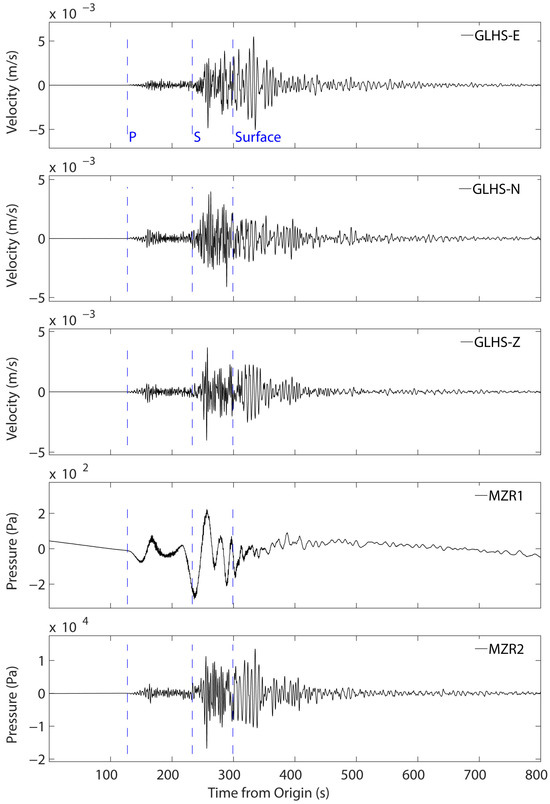 Time series of the east (E), north (N), and vertical (Z) components of the ground velocity measured at the GLHS seismic station and water pressure measured at the MZR1 and MZR2 wells during the arrival of seismic waves from a regional earthquake, on 24 January 2024, M 6.7, that occurred in Turkey at 17:55:14 UTC. The earthquake’s seismic waves arrived at the wells at 17:56:55 UTC. In this figure, time = 0 is 17:54:55 UTC.