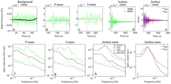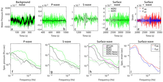 The response of the open (MZR1) and closed (MZR2) wells to the magnitude 7.8 teleseismic earthquake, originating in the Alaska region on 22 July 2020. The black and green lines represent the time series of the water pressure measurements in wells MZR1 and MZR2, respectively: (a) background noise, (b) P-wave, (c) S-wave, (d) surface wave Time series of radial (red line) and transversal (blue line) strain during the passage of surface waves (e). Spectra of well water pressure fluctuations: (f) P-wave, (g) S-wave, (h) surface wave with calculated pore water pressure (magenta). (i) Spectra of radial and transversal strain during the passage of surface waves. The dashed lines indicates background noise spectra for MZR1 well (black) and the MZR2 well (green). Note the different scales of the Y-axes.