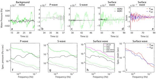 The response of the open (MZR1) and closed (MZR2) wells to the magnitude 6.7 regional earthquake, originating in central Turkey on 24 January 2020. The black and green lines represent the time series of the water pressure measurements in wells MZR1 and MZR2, respectively: (a) background noise, (b) P-wave, (c) S-wave, (d) surface wave. Time series of radial (red line) and transversal (blue line) strain during the passage of surface waves (e). Spectra of well water pressure fluctuations: (f) P-wave, (g) S-wave, (h) surface wave with calculated pore water pressure (magenta). (i) Spectra of radial and transversal strain during the passage of surface waves. The dashed lines indicates background noise spectra for MZR1 well (black) and MZR2 well (green). Note the different scales of the Y-axes.