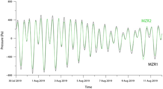 For wells, such as MZR1 and MZR2, with a hydraulic head of approximately H = 1000 m, a water density of = 1000 kg/m3, and water compressibility of = 5 × 10−10 1/Pa, the predicted volume flowing into the open well is three orders of magnitude larger than the predicted volume flowing into the closed well. This will require a longer time for the open well to fully respond to the pressure change in the aquifer. This explains why the amplitude of high-frequency pressure oscillations in the open well is significantly lower than in the closed well. According to a comparison between the spectra of the water pressure oscillations recorded in the open and closed wells (Figure 5, Figure 6 and Figure 7), the open well spectral amplitude is significantly lower and, in some cases, even approaches the noise level. This difference decreases for the low-frequency teleseismic signals and becomes negligible for the very-low-frequency signals associated with tidal variations (Figure 8).