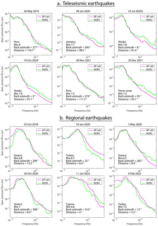 Spectral analysis of the response to seismic waves originating from six teleseismic earthquakes (a) and six regional earthquakes (b), with different locations and magnitudes. Comparison, according to the surface wave phase only, between the water pressure fluctuations in the closed well, MZR2, and the calculated water pressure fluctuations in the aquifer, according to BKu = 5.4 GPa and N = 15 GPa. Source-to-site distance and back azimuth are presented for each earthquake.