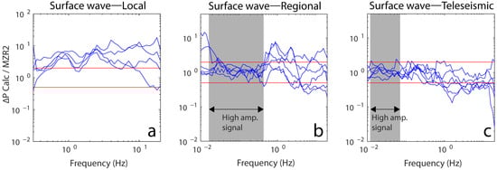 Spectral ratio between the pressure measurements in the closed well, MZR2, and the pore water pressure calculated from ground velocity measurements at the GLHS seismic station during the passage of seismic surface waves. The blue lines represent the spectral ratio for the local (a), regional (b), and teleseismic (c) events. The red horizontal lines represent the upper and lower boundaries of the good fit (ratio of 0.5–2, around a 1:1 ratio) between the pore water pressure calculated from ground motion velocities and the closed well pressure measurements. The gray rectangles represent the average frequency range where the MZR2 signal spectra show the highest amplitudes for the regional (b) and teleseismic (c) events.