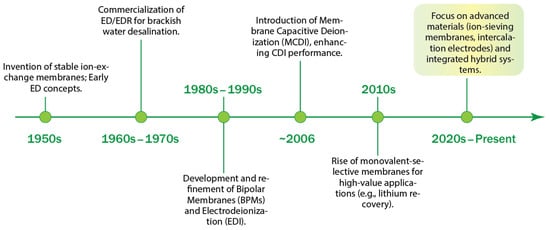 Figure 2 illustrates the timeline of key milestones in electro-driven membrane technologies, revealing a clear historical progression from general deionization to more specialized and selective applications for targeted resource recovery.