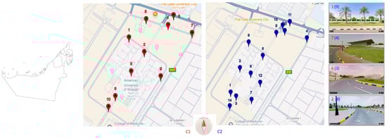 Sampling locations, including first campaign (C1) and second campaign (C2). Street view figures represent locations from C1, namely, 1, 7, 6, and 2, and from C2, namely, 9, 4, 3, and 8 (from top to bottom). Map created using Google Earth.